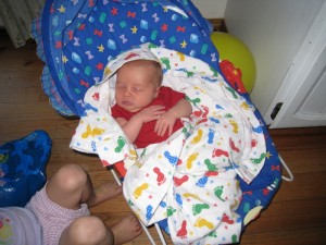 Sterling went to the doctor today for his 2 week check up. The PKU test was terrible…he cried so hard he fell asleep (practically passed out). Later at home it seemed he remembered the event and continued the crying. It is hard being cute and little!