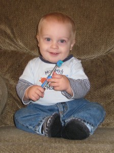 Vampire baby Posted on November 25, 2011 by kathy Eigen is now 10 months old. His first tooth broke through on Monday the 21st, top left lateral incisor…or vampire baby He is lots of fun, especially when he gets enough sleep. Love the boy.