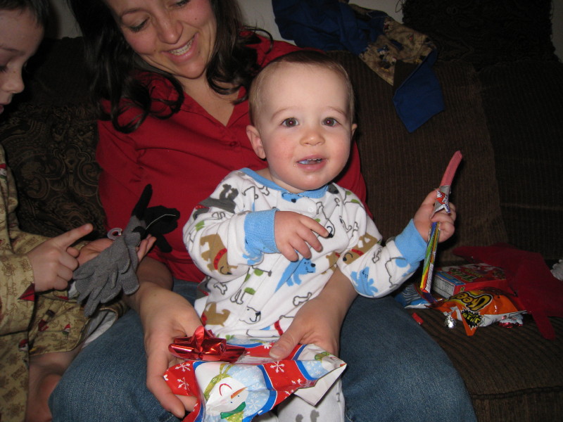 Sterling still trying to wake up. The candy was enticing, but opening presents was a bit much to get excited about.