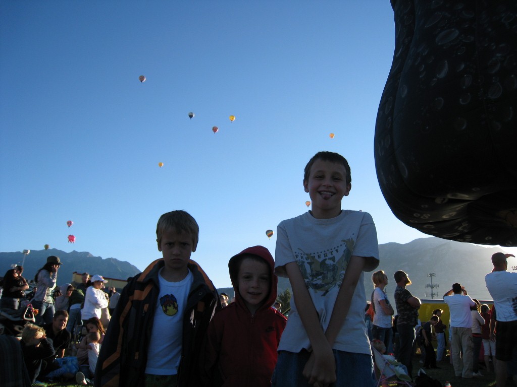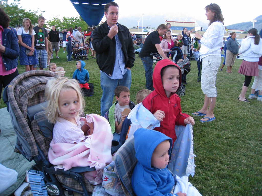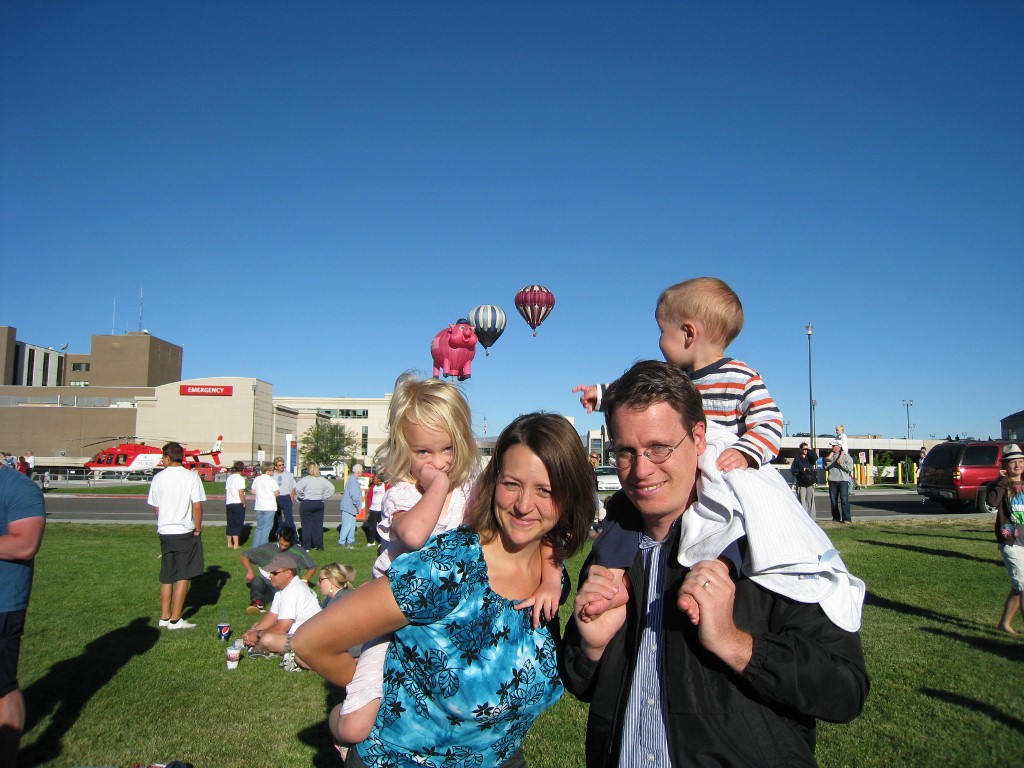 Monday July 5th we woke up really early and ventured to the hot air balloon festival. We joined the masses of tired and sleepy people. Thanks to Driel and Grandma we had donuts, bagels, fruit, water and life was pretty great again. Being woken up is hard on some of the kids. Sterling and Bridget thought it was great to get up and go bright and early. The hot air balloons were impressive up close, and very exciting to watch in the sky. The kids, especially Sterling, really loved the pink pig! Notice we all needed jackets in July, unusually cool morning!