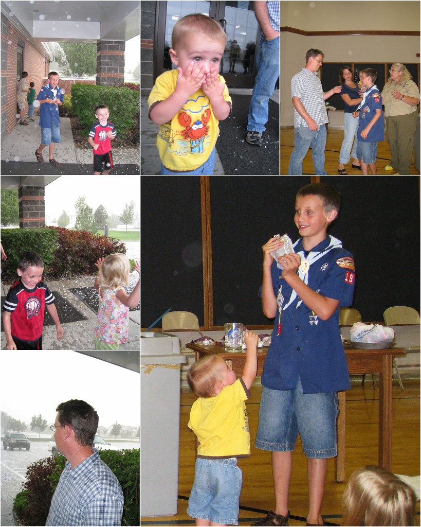 Cub Scouts Posted on September 20, 2010 by kathy Kimball earned his bear rank in cub scouts. Before the meeting started, we marveled at the unbelievable hail storm. This is early August, the ground is covered in 1-2 inches of dice size hail and super wet! Pretty exciting times.