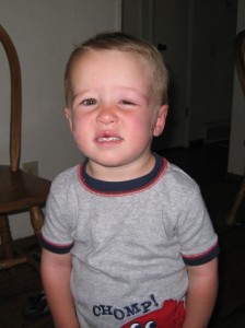 Beat Up Posted on September 21, 2010 by kathy Poor kid…looks like he got in a brawl. Sterling got a fat lip from falling. The next morning he woke up with a bug bite on his eye. He really brought on the drama for lots of attention.